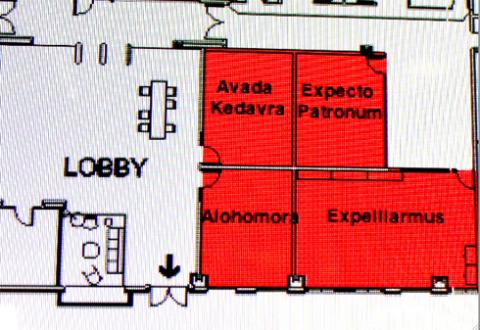 Tại Facebook có rất nhiều fan của Harry Potter. Trong sơ đồ tòa nhà có thể thấy những khu vực được đặt theo các thần chú trong truyện này như Avada Kedavra (Lời nguyền chết chóc), Expecto Patronum (Cầu hiện Thần hộ mệnh), Alohomora (Mở khóa) hay Expelllarmus (Thần chú Tước vũ khí)...