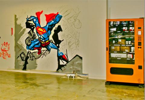 Cậu bé Calvin, siêu nhân Superman bên cạnh tủ đựng thiết bị và phụ kiện.